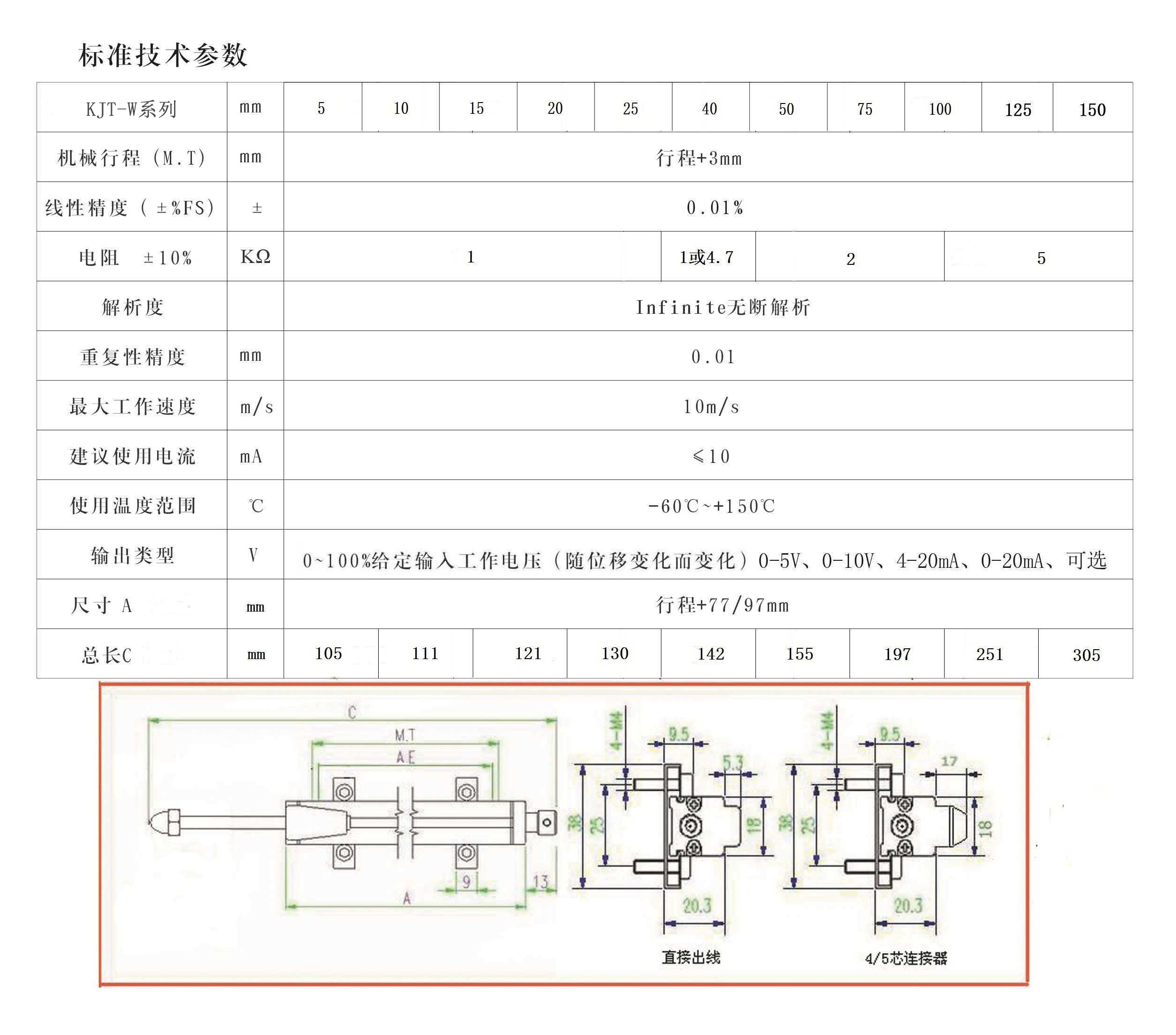 3、電阻(KΩ±10%):1(5~25mm有效行程);2(40-50mm有效行程);5.0(75~150mm有效行程);